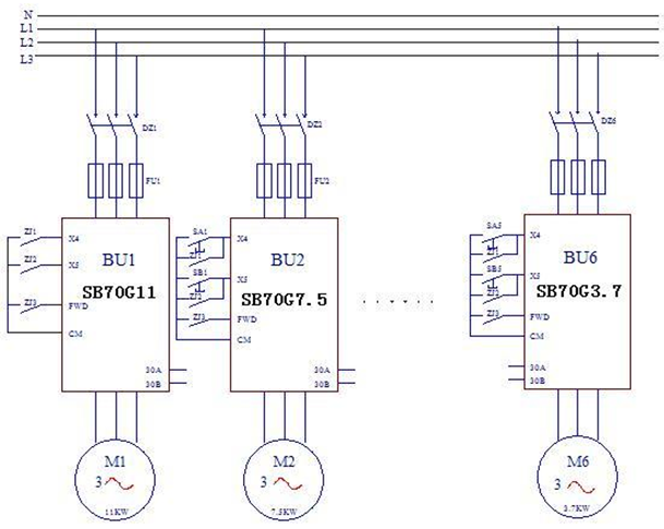 四川眉山仲輝集團造紙廠,生產多種文化用紙,有多條造紙生產線,主要是1092小紙機,也有1770紙機。這些紙機是早年的產品,傳動部分有總軸傳動和分部傳動,分部傳動又有電磁調速傳動和直流調速傳動。由于使用年代較久,故障率較高,迫切需要改造。從2003年起,先后對這些紙機實施了變頻改造,全部改造都使用了希望森蘭的變頻器,主要使用SB70G系列變頻器。實踐證明,SB70G系列通用變頻器,開環控制的精度可以適應類似1092、1770這類低速紙機的要求,并且變頻器的穩定性和可靠性較高,減少了因電磁調速和直流調速故障而產生的停機損失。