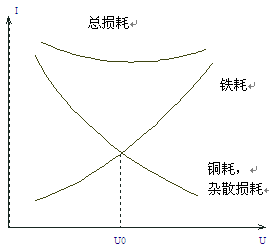異步電機的損耗有銅耗,基本鐵心損耗,常稱為鐵耗,機械磨擦損耗和雜散損耗。對已定型生產(chǎn)的電動機,機械磨擦損耗在運行過程中為常值;銅耗與電機電流的平方成正比,隨負(fù)載的變化而變化;鐵耗近似與電機端電壓的平方成正比;雜散損耗與電機電流的平方成正比,隨負(fù)載的變化而變化。對于90kW電機,以上各種損耗占總損耗的百分?jǐn)?shù)分別是銅耗20%~30%,鐵耗20%,機械磨擦損耗40%~50%,雜散損耗15%~20%。對相同的負(fù)載,電機端電壓的升高,電流會減小,因此當(dāng)端電壓升高時,銅耗和雜散損耗減小;而鐵損增加。這樣,電機的端電壓存在有一點,在這點時電機的總損耗為最小,如圖一。