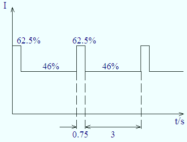 某陶瓷廠90kW球磨機的負(fù)載情況如下:球磨機電機90kW,料筒的轉(zhuǎn)速為16r/min,每個工作周期等于3.75s,電流在80~110A之間變化,相當(dāng)于額定電流的46%~62.5%,如圖二所示: