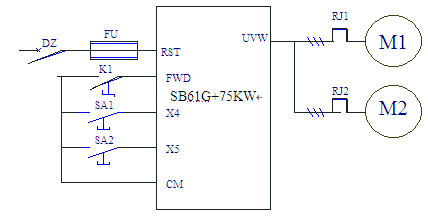 根據以上的情況,選用森蘭SB61G+系列變頻器。如果用兩臺37kW變頻器,就需要考慮同步控制,這樣做同步效果好,但需外接同步器比較麻煩。用一臺75kW變頻器控制兩臺電動機,由于兩臺電動機的特性有一定的差異,其速度也會有速度差,如果速差不大還是可以滿足使用要求。鑄管機對兩臺電機的同步要求不高,為簡單采用電機并聯,選用一臺SB61G+75KW變頻器拖動兩臺37kW電機運行,為保護電機,每臺電機需裝熱繼電器,如圖8-2中的RJ1、RJ2。設定F01=3,調速用X4、X5端子按鈕控制,按X4升速,按X5降速。停車時間設為120s,降速到變頻器的輸出頻率5Hz時,啟用直流制動。現場測試,有一臺電機的線電流為57A,另一臺電機的線電流為38A,調整變頻器的特性曲線,使兩電機的線電流之差盡量縮小。變頻調速控制原理如圖2所示。
