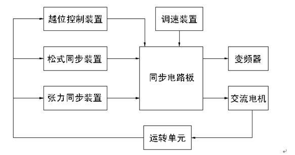 印染設備大多為幾十米到一百多米的長車,多臺電機同時帶動各個軋輥、導帶、烘缸和各種擺布架轉動,各單元的布速必須一致,產生的絕對誤差必須能很快自動糾正過來。客戶將各單元的直流電機改用森蘭SB70系列變頻器控制的交流電機,配上自主開發的性能良好的同步板、張力同步裝置、松式同步裝置、非接觸式越位保護裝置和導帶糾偏裝置等,其同步性、可靠性可大大提高,升降速平穩,故障大大降低,產品質量提高,很少因電氣故障而停車和出疵品。到目前,我們企業已在圓網印花機、復漂機、絲光機、定型機、皂洗機、退煮漂聯合機和高溫拉幅機等長車上安裝使用森蘭變頻器八十多臺,并準備一年左右將其他長車全部改由變頻控制。長車變頻系統控制圖如圖3: