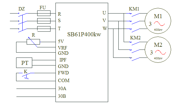 1﹑變頻器采用森蘭SB61P400??紤]到電機是一用一備,為節省投資,兩臺風機電機共用一臺變頻器,當電機需要倒換時,僅改變電機外部的接線,變頻器控制原理圖如圖2所示。PT為壓力變送器,為四線式的壓力變送器接線,還有兩根電源線未畫出。R為給定調節,也可以用操作面板給定。KM1﹑KM2控制那臺電機運行。