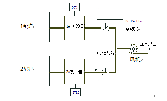 某焦化廠煉焦爐鼓冷系統有兩臺400kW離心風機,一用一備,安裝在兩臺初冷器之前,即一臺鼓風機同時對兩臺初冷器中的煤氣進行抽取。工藝上要保證初冷器內維持120Pa正壓,則鼓風機需要調速,原系統采用液力偶合器調速。另外,還要求兩臺初冷器內的正壓相同,均為120Pa。原系統是在初冷器的出口處設置手動閥門用人工調節,在調節過程中,不僅要調節閥門的開度,還要同時調節液力偶合器的油壓,以此調節風機的轉速。閥門和轉速都要調節,二者又有一定的偶合度,常常顧此失彼,很難達到工藝要求。另外,液力偶合器調速的穩定性較差及調速的不方便,而且效率低,為滿足生產工藝的要求和節能,需要對其進行改造。